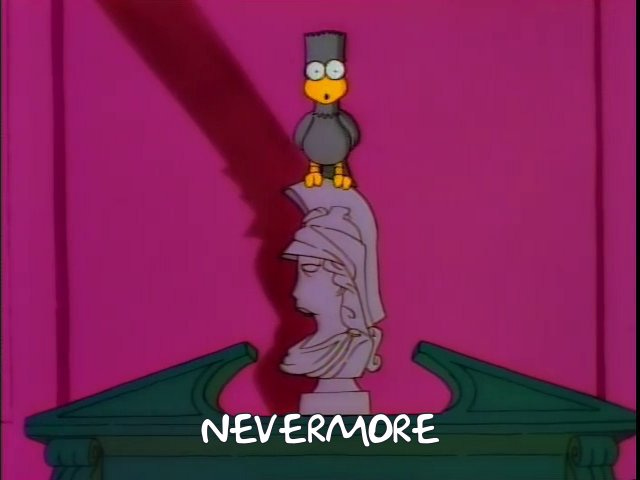 There’s something lovely about The Raven. Its modesty. It’s a reading of a classic poem, set to the animation of The Simpsons, with a gorgeous gothic orchestral soundtrack. Marge is Lenore, Homer is the widow (and Dan Castellaneta gives an inspired performance). Maggie and Lisa are the Seraphim.
