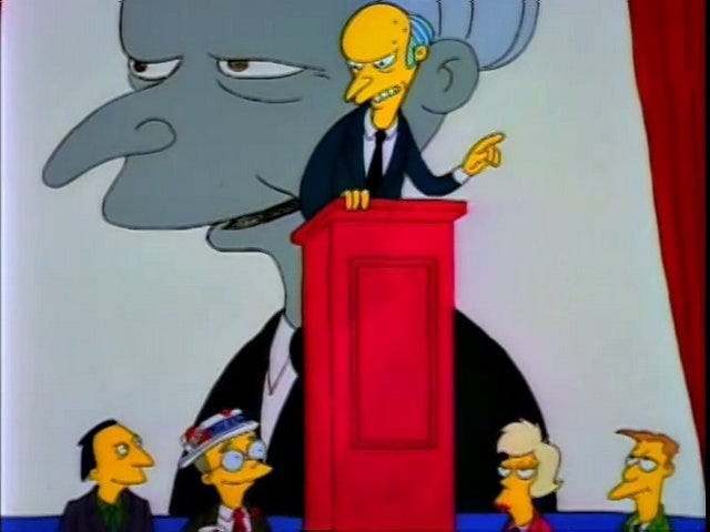 Ironic, isn't it Smithers? This anonymous clan of slack-jawed troglodytes cost me the election, but if I had them killed, I'd be the one to go to jail. That's democracy.
